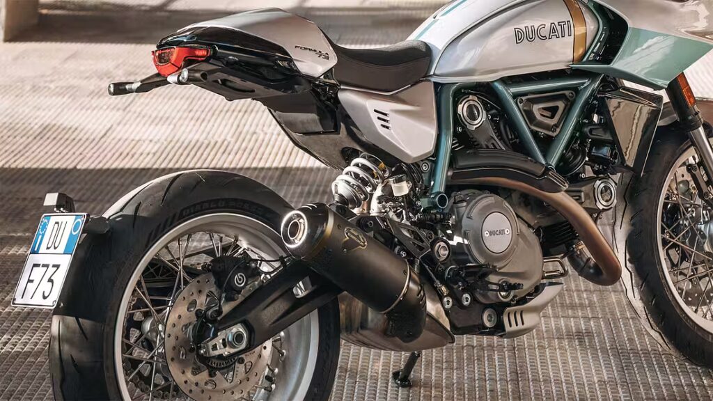 Basen kommer från Ducatis Scrambler-plattform. Den luft- och oljekylda V-twinnen på 803 kubik levererar 73 hästkrafter vid 8 250 rpm och använder fortfarande två desmodromiskt styrda ventiler per cylinder – ett tydligt tecken på märkets tekniska arv. Växellådan har sex steg och quickshifter är standard. Ljudet? Signerat Termignoni.