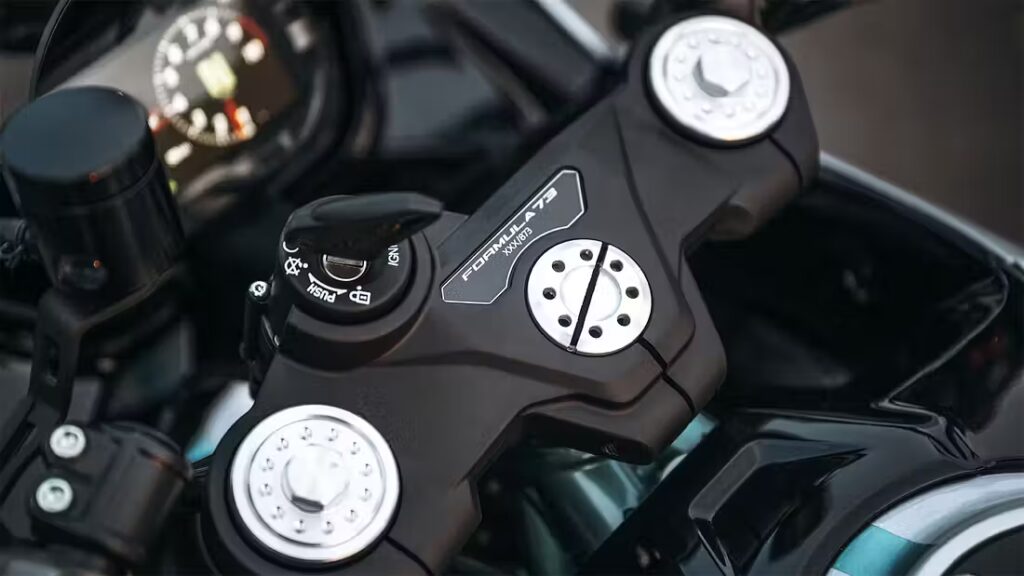 Stålrörsramen för tankarna till märkets klassiker, medan Kayaba-komponenter sköter fjädringen: en inverterad framgaffel och enkeldämpare. Formula 73 rullar på trådekrade hjul med Pirelli Diablo Rosso IV i dimensionerna 120/70 R17 fram och 180/55 R17 bak – klassiskt utseende med modern greppnivå.
