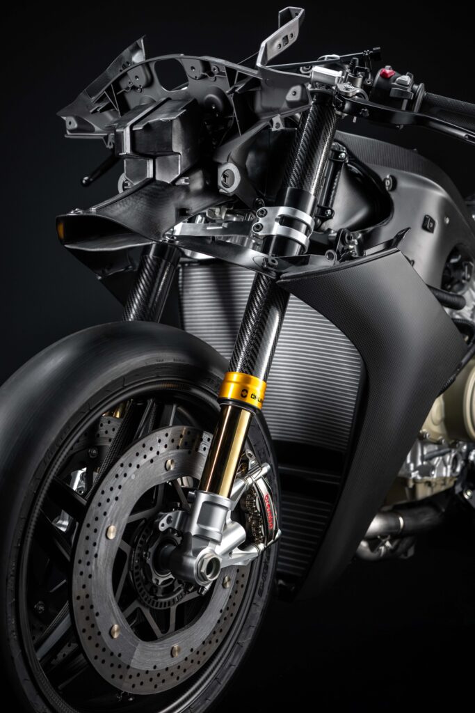 Centenario är en fullständig orgie i kolfiber. Förutom kåporna, ramen och bakramen är även svingen, fälgarna och Öhlins-framgaffelns ytterrör i lättviktsmaterialet. Dessutom har bromsarna keramiska kolfiberskivor. Vikten anges till 173 kg utan bränsle, och går ner till 167 kg när man monterar ett Racing Kit – som är standard.