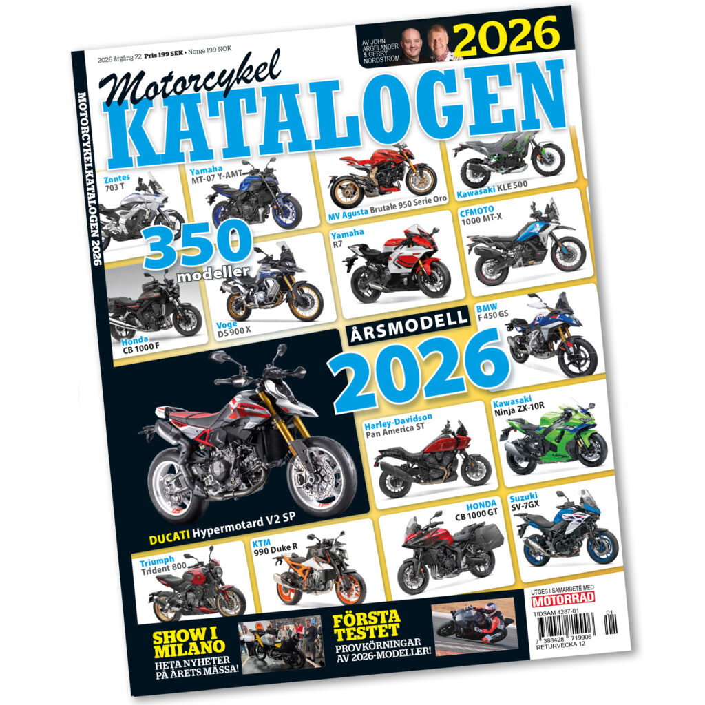 Stora Motorcykelkatalogen 2026 är ”hojbibeln” med samtliga 2026 års motorcyklar. Den är 180 sidor tjock, med omdömen, fakta och priser på samtliga motorcykelmodeller på den svenska marknaden – utkommer den 14 januari 2026. Priset är 199 kronor.