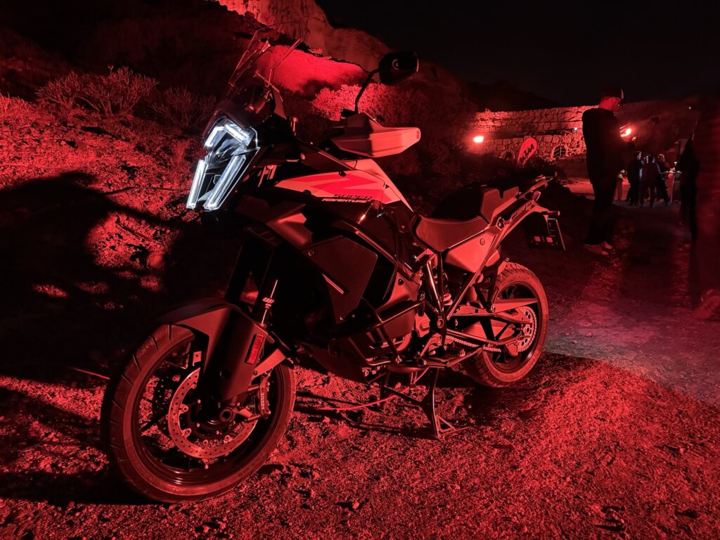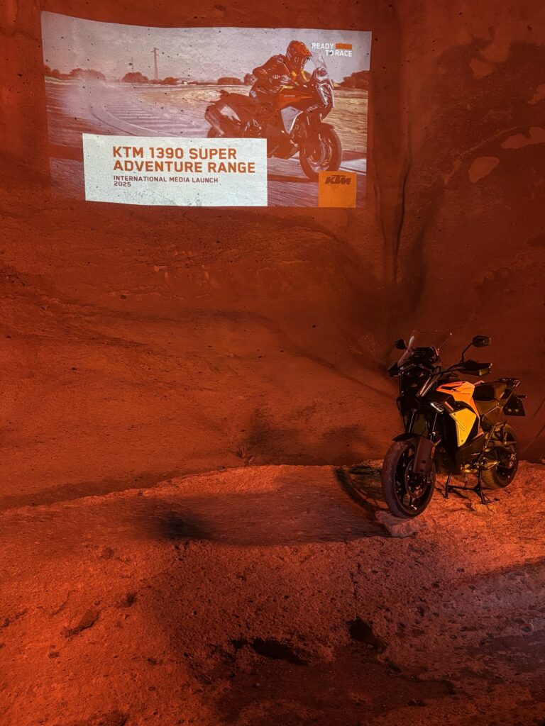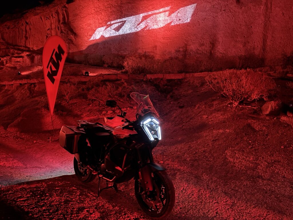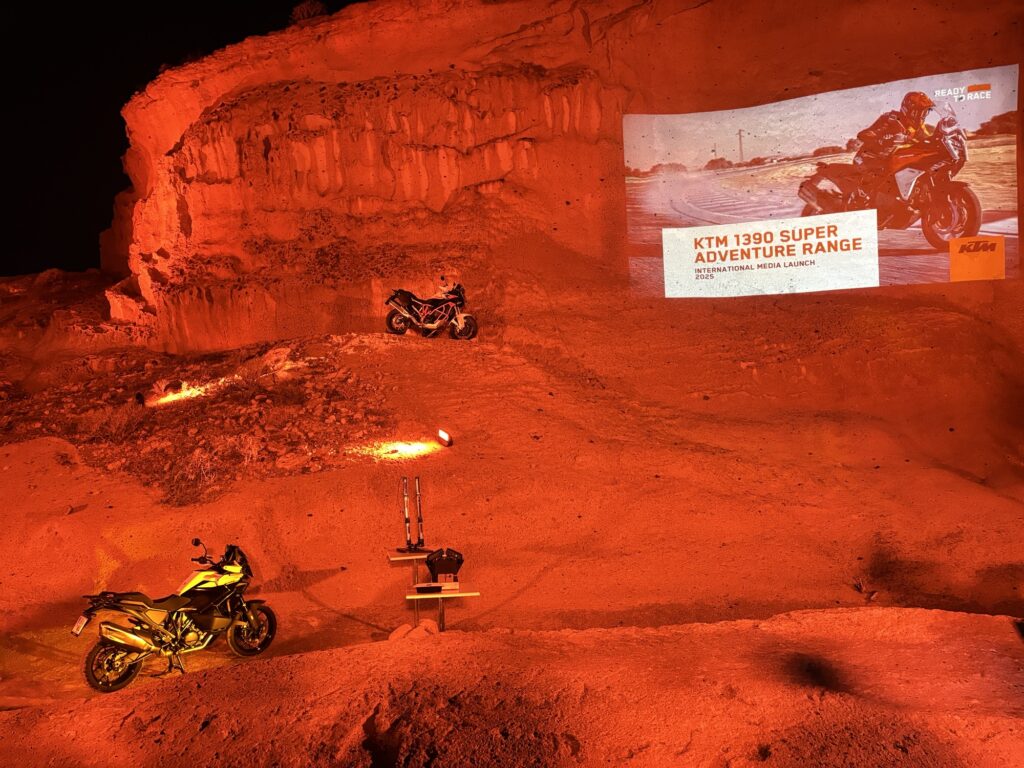I ett maffigt bergsområde, kallat San Blas, precis utanför hotellet, presenterade ikväll KTM sin nya stora Adventurehoj. Projicerat på bergsväggarna och såklart upplyst med orangea lampor fick vi en första smak av KTM 1390 Super Adventure S EVO. Teknikspäckad är ett milt uttryck, här har KTM formligen öst tekniska och elektroniska nyheter på hojen. Mycket tack vare den nya stående TFT-skärmen på hela åtta tums storlek som möjliggör en hittills aldrig skådad myriad av inställningsmöjligheter.