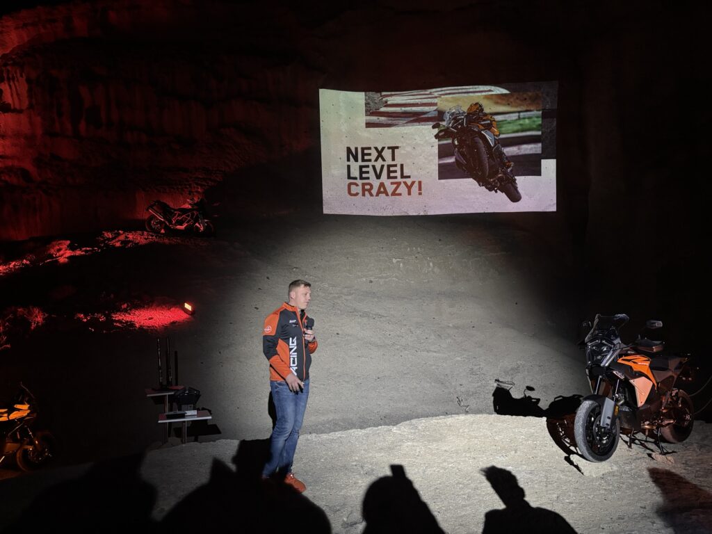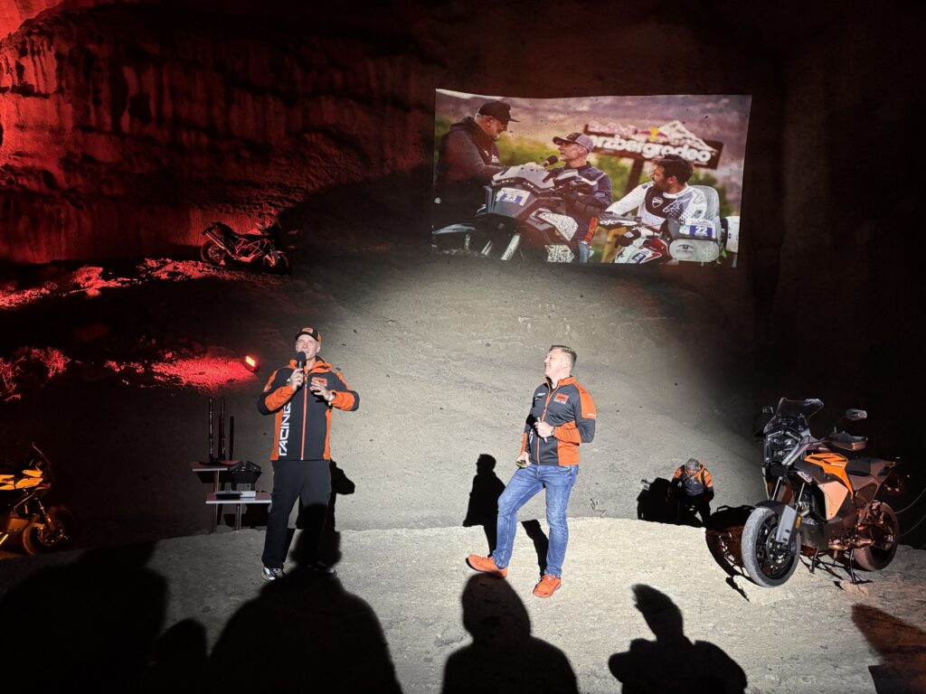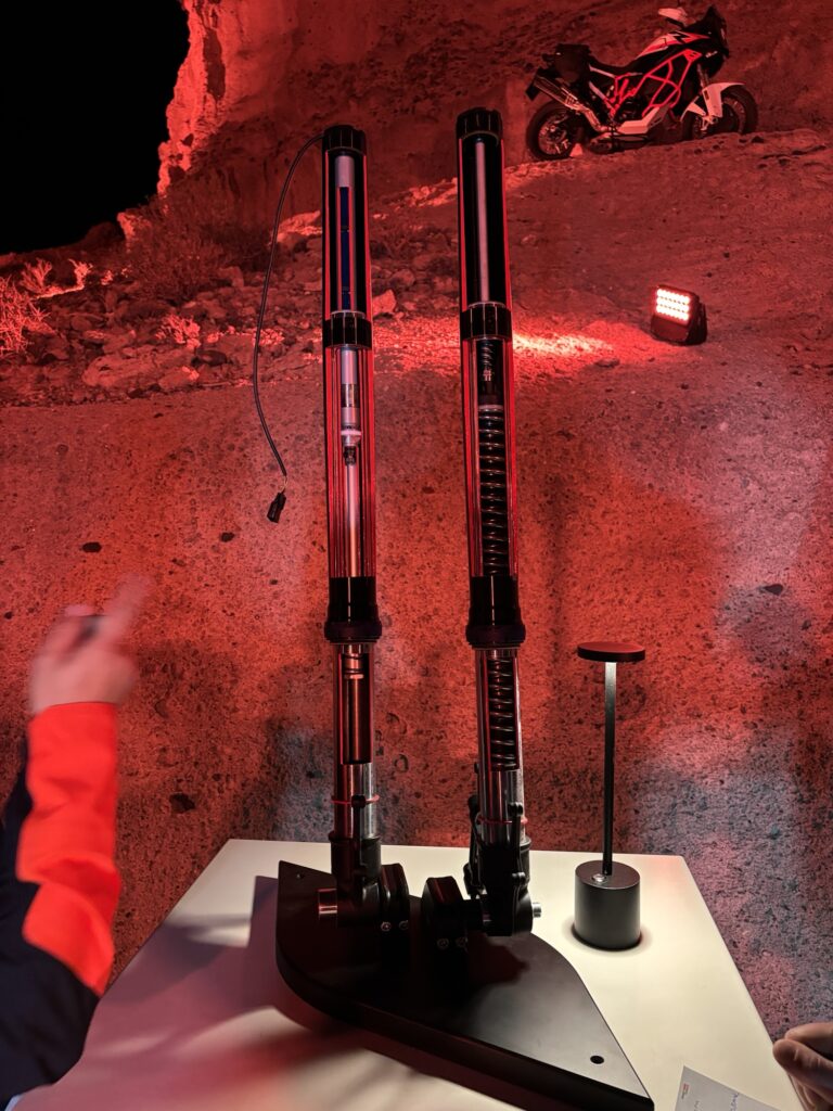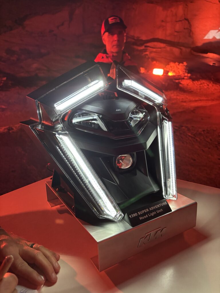 I ett maffigt bergsområde, kallat San Blas, precis utanför hotellet, presenterade ikväll KTM sin nya stora Adventurehoj. Projicerat på bergsväggarna och såklart upplyst med orangea lampor fick vi en första smak av KTM 1390 Super Adventure S EVO. Teknikspäckad är ett milt uttryck, här har KTM formligen öst tekniska och elektroniska nyheter på hojen. Mycket tack vare den nya stående TFT-skärmen på hela åtta tums storlek som möjliggör en hittills aldrig skådad myriad av inställningsmöjligheter.