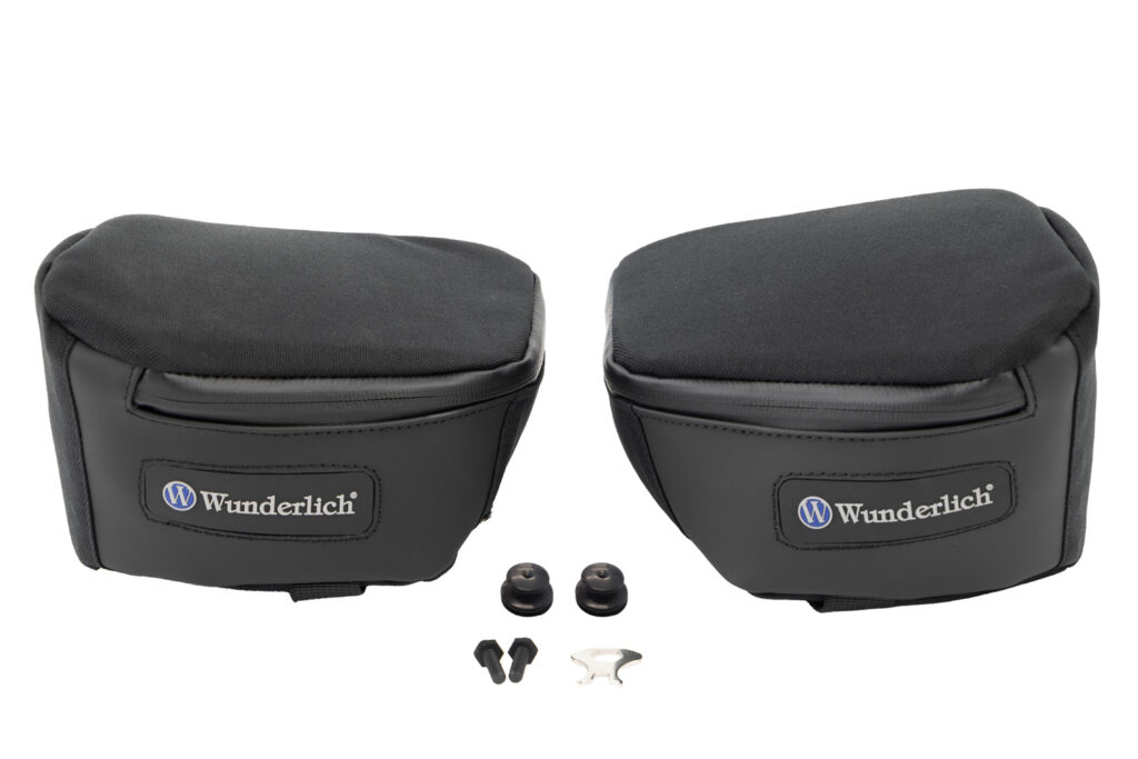 Wunderlich har tillverkat de funktionella väskorna i detta set för att passa vindavvisarna på kåpan perfekt, vilket utnyttjar det tillgängliga utrymmet optimalt. BMW-specialisterna lade stor vikt vid god tillgänglighet så att det skyddade innehållet när som helst lätt kan nås från sadeln. Fordonsdokument och plånböcker kan förvaras säkert i dem. Starka kardborreband och en LOXX snabbfäste gör att väskorna kan fästas och tas bort snabbt och säkert. De sitter säkert och utan att fladdra när du cyklar. Konstruktionen i flera lager säkerställer skydd och dimensionsstabilitet – även när den är tom. De dolda dragkedjorna med greppvänliga dragare är vattenavvisande och dammtäta. CORDURA-tyget® är extremt nötningsbeständigt, UV-stabilt, vattenavvisande och belagt på insidan. Typiskt för Wunderlich är det blå innerfodret, som ger den nödvändiga kontrasten för att enkelt hitta små föremål när du är på språng. Med Wunderlich varumärkeslogotyp.